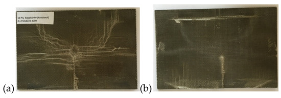 Furthermore, interestingly, in both cases, it was not possible to penetrate the panels even if a higher value of the maximum load, Umax, is recorded for the PP/Basalt composite sample (Table 3). This behavior is highlighted in Figure 5 and Figure 6. It is evident that both the non-compatibilized and the compatibilized specimens battle to the penetration presenting only a hunching due to the impact event.