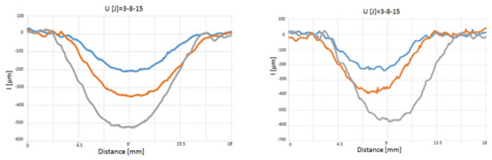 The last assertion is confirmed by measurements of the indentation depth representing the footprint impress by the impactor on the impacted side of the sample (residual plastic deformation) shown in Figure 13. The results demonstrated that this parameter increases at the increasing of the impact energy, U, for both types of basalt composite samples.