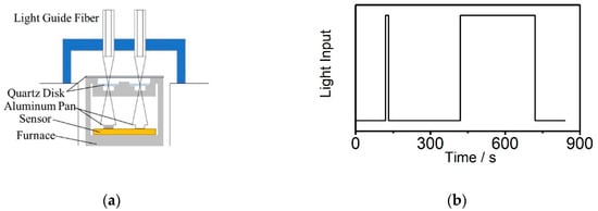 Photo-DSC structure and exposure program: (a) the cross-section structure of the photo-DSC furnace where (b) the curing program is composed of two parts: the preliminary exposure time and the complete cure time of the resin.