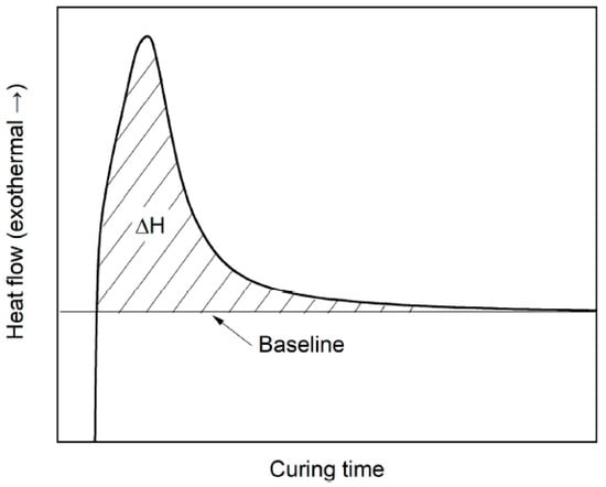 The experimental extent of curing degree at time t was determined by relating the obtained heat of reaction at time t to the total measured heat of reaction after 5 min, ΔHtotal, after the heat flux remains stable. The curing degree α(t) was determined by relating the obtained reaction heat Ht at time t to the theoretical total reaction heat ΔHtotal. The q(t) was defined as the exothermal heat flux at time t. The curing degree α(t) can be defined as expressed in Equation (1). The baseline is a straight tangential line to the horizontal part of the isothermal DSC curve as shown in Figure 3. Each parameter was measured three times and the mean value was used for the calculation of the curing degree.