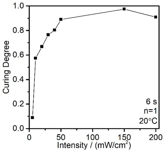 Light intensity is one of the key parameters in the experiments, the level is set based on reference and the technical spec of the equipment [,,]. Several energy levels, 50, 100, 200 mW/cm2, were tested as a pretest. The results are shown in Figure 4, which indicates that a relatively high level of curing degree has already been reached at 50 mW/cm2 during the process. The higher light intensity will make the results difficult to identify the differences between each parameter. In this case, the range of 5 to 50 mW/cm2 was selected to find out the trend of curing degree during the curing process.