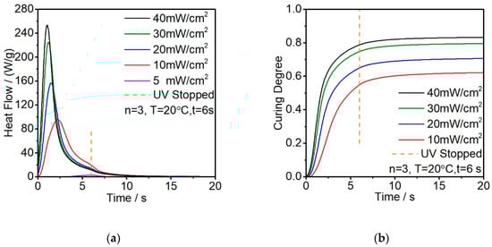The influence of the UV light intensity on the photopolymerization process was studied by setting the exposure energy to five different levels. The energy was changed by adjusting the filter between the light guide and the samples. Then, 5, 10, 20, 30, 40 mW/cm2 were selected based on the pretests. Figure 5a shows the first irradiation measurement. The results show that the exothermic effects measured by photo-DSC for photopolymerization conducted at 20 °C using various UV light intensities. As the light intensity increases, the amount of exothermic heat tends to increase. The time that the resin reaches the exothermic peak represents the earlier starting point and the higher reaction speed, 40 mW/cm2 is about 2.5 s earlier compared to that of 10 mW/cm2 and the slope of the curves indicates the difference in the curing rate.