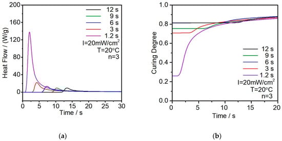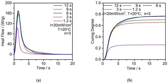 The results, as shown in Figure 6a, show that longer exposure time will slightly increase the reaction heat. Since the concentration of photoinitiator and the light intensity in these experiments are fixed, the reaction rate shows the same tendency that the heat flow reaches the peak at almost the same time at 2 s. The exposure time of 1.2 s is relatively too short that the heat flow is significantly lower than that of the other parameters.