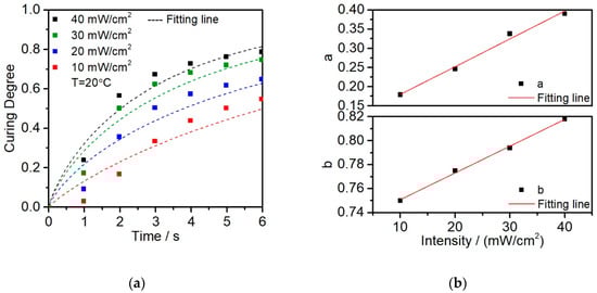 (a) Curing degree with different light intensity and related fitting curves by modified Avrami model; (b) experiment points and fitting line of undetermined coefficients a and b.