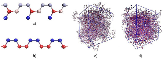 Models of polymeric systems: (a) fragment of -1,4-polyisoprene chain: C atom (red), CH group (pink), group (grey), group (blue); (b) fragment of -1,4-polybutadiene chain: CH group (blue), group (red); (c) 27 chains of polyisoprene in periodic supercell; (d) 27 chains of polybutadiene in periodic supercell.