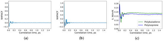 (a) Normalized heat flux autocorrelation function (NHFACF) of polyisoprene; (b) normalized heat flux autocorrelation function (NHFACF) of polybutadiene; (c) thermal conductivities of polyisoprene and polybutadiene at 22 °C and atmospheric pressure.