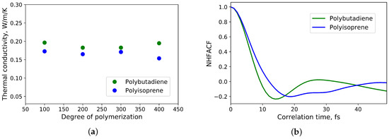 (a) Dependence of thermal conductivity of polyisoprene and polybutadiene from the degree of polymerisation and number of simulated atoms; (b) the first minima of the normalized heat flux autocorrelation functions of polyisoprene and polybutadiene.