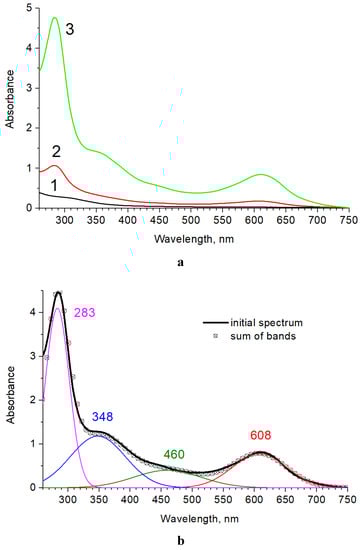 Figure 3a shows the electronic absorption spectra of films that are based on chitosan crosslinked with genipin at different Gp/NH2 ratios. The absorption spectrum of pure chitosan exhibits weak bands in the area below 400 nm. Intensive absorption bands in the range of 260–700 nm appear in films with Gp (Figure 3a).