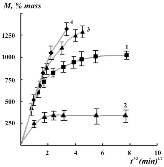 The values of the molecular weight of the grid between the mesh nodes Mc can be calculated while using the values of the equilibrium degree of swelling (Figure 4) and the paired interaction parameter χ obtained from sorption isotherms according to the Flory–Riener equation [37].