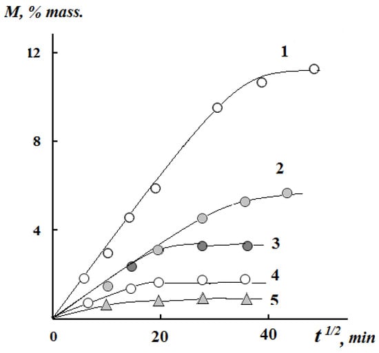 Figure 5 shows the kinetic curves of interval sorption of water vapor for chitosan films crosslinked with genipin at different ambient humidity. It can also be seen that the Fick kinetics of the sorption equilibrium establishment is observed for all types of crosslinked and non-crosslinked samples in these conditions. The difference in sorption kinetics and swelling kinetics is only in the speed of sorption equilibrium establishment. It is most vividly manifested in the values of translational coefficients of water diffusion, which we estimated from experimental data M–t1/2, while using Equation (2)