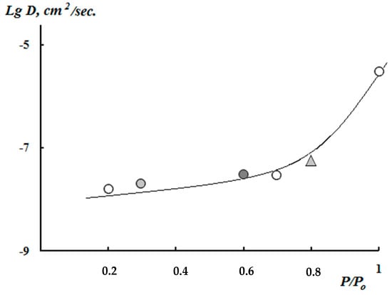 Figure 6 shows the coefficients of water diffusion in chitosan films, depending on the relative humidity of the environment. It is seen that, with increasing humidity, the translational mobility of sorbed water molecules increases, which indicates the plasticization of chitosan films crosslinked with genipin. Obviously, this result indicates that it is possible to apply the Flory–Riener Equation (3) to calculate the chemical bonds grid density of chitosan films crosslinked with genipin.