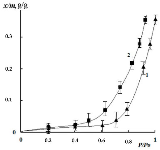 Isotherms of water vapor sorption of chitosan films, crosslinked by genipin. 1—Gp/NH2 ratio 0.02 mol/mol; 2—0.003 mol/mol.