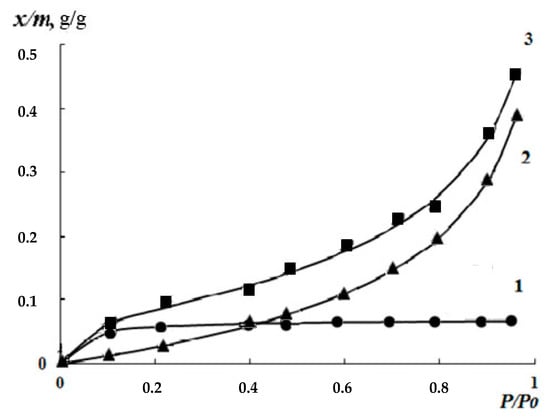 Decomposition of the film water vapor sorption isotherm (3) in the framework of the Flory–Haggins model: 1—Langmuir isotherm, 2—Flory-Haggins isotherm.