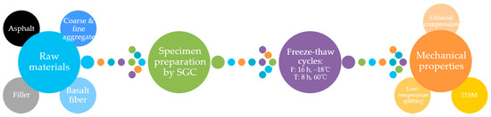 - Cheng, Y.C.; Yu, D.; Tan, G.J.; Wang, W.S.; Zhang, P. Evolution on freeze-thaw damage of basalt fiber asphalt mixture. J. Harbin Eng. Univ. 2019, 40, 518–524. (In Chinese) [Google Scholar]