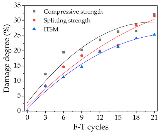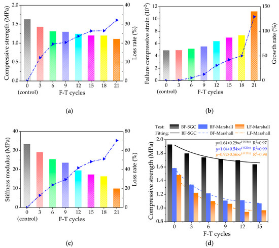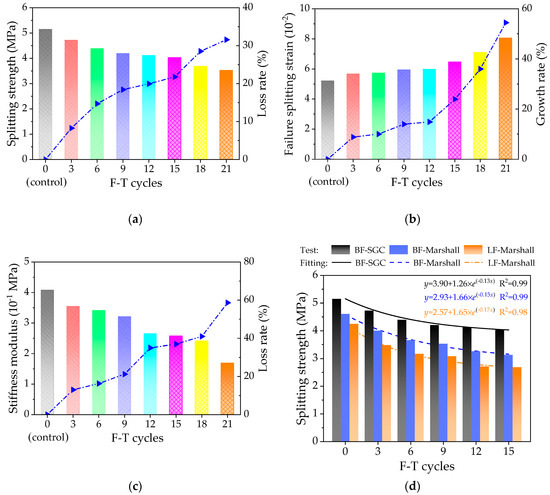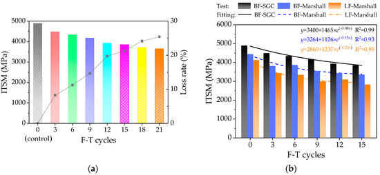 - As for the indirect tensile stiffness modulus, the loss rate of ITSM showed a gradual slow increasing trend. In addition, the exponential function could well reflect the variation trend of the mechanical performances with F-T cycles.