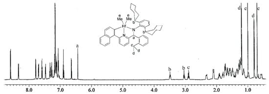 Reactions of metalation of the ligands containing a cycloheptyl, cyclohexyl, cyclopentyl, 3-pentyl, or phenyl substituent (13–16 and 18) were successfully carried out by sequential treatment with n-BuLi in toluene at room temperature, with HfCl4 at 100 °C for 2 h, and finally with 3.5 eq of MeMgBr at room temperature. The yields were satisfactorily high (60%–68%). The same treatment of the ligand carrying an ethyl substituent (17) did not afford the desired complexes. However, the desired complex (23) was obtained in high yield (65%) when 17 was treated with HfMe4 generated in situ in the reaction of HfCl4 with 4 eq of MeMgBr at −35 °C [51]. The product was isolated as a light-yellow solid through trituration in hexane. In a 1H NMR spectrum of I, two sets of signals were noted, which were attributed to the presence of a rotamer at ~7 mol% owing to restricted rotation around the NC−C6H4(2-iPr) bond [8]. In the case of 23 (bearing a small ethyl substituent), such rotamer signals were observed, but in the other complexes, only one set of signals was noted (Figure 1 and Figures S23–S28). Two singlet signals assigned to Hf-CH3 were observed in regions 0.0–1.0 and 62–67 ppm in the 1H and 13C NMR spectra, respectively.