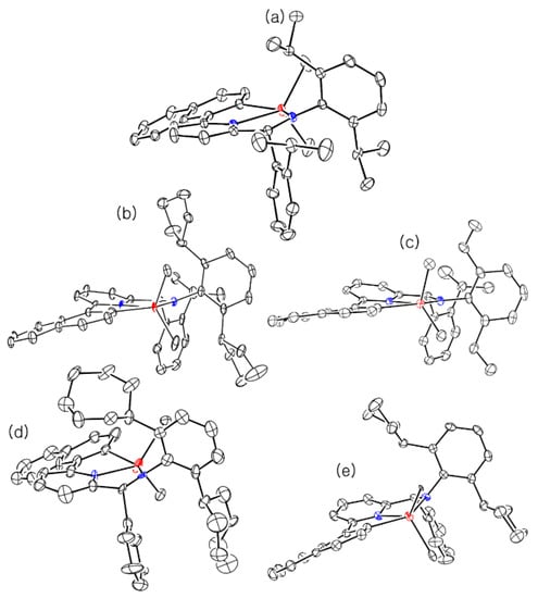 Thermal ellipsoid plots (a 30% probability level) of I (a), 21 (b), 23 (c), 34 (d), and 36 (e). Hydrogen atoms are omitted for clarity.