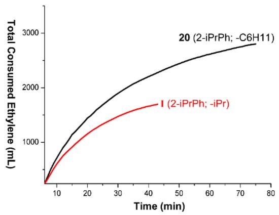 The prepared complexes along with comparison compound I were screened using 1.0 µmol of the Hf complex as a catalyst and 150 µmol of (hexyl)2Zn as a chain transfer agent under identical conditions after Hf complexes were activated with anhydrous [(C18H37)2N(H)Me]+[B(C6F5)4]− [5,7,28]. Catalysts derived from 19 and 20 bearing the 2-iPrC6H4C(H)-moiety and a cycloheptyl or cyclohexyl substituent survived for longer periods than did the catalyst derived from I, as was expected, and, consequently, those complexes (19 and 20) manifested somewhat higher activity than I did (10 vs. 8.5 g). The rate of monomer consumption decreased with time in all cases, but the time that it took for the rate to become negligible was ~40 min for I and ~70 min for 19 and 20. In a separate experiment, in which ethylene instead of the ethylene–propylene gas mixture was fed under constant pressure (10 bar) to monitor the ethylene consumption rate with a MFC, it was clearly demonstrated that the catalyst derived from 20 had longer lifetime (~70 min) with higher activity in comparison with I (~40 min; Figure 3).