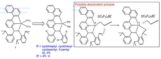 Homogeneous single-site catalysts, which were introduced by Kaminsky with the serendipitous discovery of methylaluminoxane, have evolved from the original metallocenes (constructed via two cyclopentadienyl ligands) to half-metallocenes (constructed using a cyclopentadienyl ligand) and further to postmetallocenes (constructed via noncyclopentadienyl ligands). A representative flagship catalyst among postmetallocenes is a pyridylamido hafnium complex (I in Scheme 1) discovered by high-throughput screening in the early 2000s [1,2,3,4]. It shows advantageous performance in ethylene and α-olefin (co)polymerization reactions, though its activation reaction is rather tricky [5,6,7]. In ethylene/α-olefin copolymerization reactions, it is capable of incorporating a large amount of α-olefins (uniquely among Hf catalysts) [8,9]. α-Olefin content in the copolymer generated with I is comparable with that in the copolymer generated with a constrained geometry complex, [Me2Si(η5-C5Me4)NtBu]TiMe2, though its activity is significantly lower than that of the constrained geometry complex (~1/15). Besides this, it can polymerize a propylene monomer with high isoselectivity [10,11,12]. The most surprising feature is that the β-elimination process (or a β-hydrogen transfer reaction) is completely prevented with I, enabling living olefin polymerization and consequently enabling the architecture of high-molecular-weight polyolefin chains of various block compositions [13]. Density functional theory calculations have shown that an agostic interaction between a Hf center and a β-hydrogen, via which the β-elimination process takes place, is absent in the activated complex of I [12]. Such a β-elimination process is inevitable especially in ethylene/α-olefin copolymerization reactions performed with the conventional Zr-based metallocene and Ti-based half-metallocene catalysts [14].