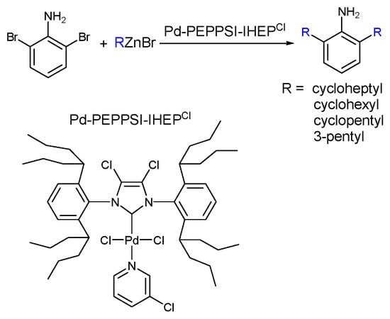 - Atwater, B.; Chandrasoma, N.; Mitchell, D.; Rodriguez, M.J.; Pompeo, M.; Froese, R.D.J.; Organ, M.G. The selective cross-coupling of secondary Alkyl Zinc reagents to five-membered-ring heterocycles using Pd-PEPPSI-IHeptCl. Angew. Chem. Int. Ed. 2015, 54, 9502–9506. [Google Scholar] [CrossRef]