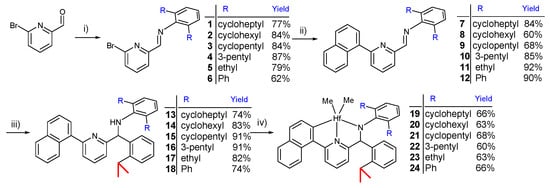 2,6-R2-Anilines were prepared from 2,6-dibromoaniline by the Negishi coupling reaction with various RZnBr compounds (R = cycloheptyl, cyclohexyl, cyclopentyl, or 3-pentyl) using a PdCl2 complex coordinated by NHC ligands bearing 2,6-di(3-heptyl)phenyl-N moieties as a catalyst (Scheme 2; see Figures S1–S4 for 1H and 13C NMR spectra) [31]. 2,6-Diphenylaniline was prepared by Suzuki coupling with PhB(OH)2 by means of the Pd(OAc)2 catalyst. Using 2,6-R2-anilines (R = cycloheptyl, cyclohexyl, cyclopentyl, 3-pentyl, ethyl, or Ph), a series of derivatives of I was prepared according to the synthetic scheme disclosed in a patent filed by Dow (Scheme 3). Thus, the starting material 6-bromo-2-pyridinecarboxaldehyde was converted to imine compounds 1–6 through condensation with aniline derivatives, and then the Suzuki coupling reaction was carried out with naphthylboronic acid (see Figures S5–S10 for 1H and 13C NMR spectra). The resulting 2-naphthylpyridyl imine compounds 7–12 (see Figures S11–S16 for 1H and 13C NMR spectra) were reacted with 2-isopropylphenyllithium to obtain target ligands 13–18 (see Figures S17–S22 for 1H and 13C NMR spectra). 2-Isopropylphenyllithium was generated from 1-bromo-2-isopropylbenzene by treatment with n-butyllithium (n-BuLi) in diethyl ether, which had to be isolated before use via thorough removal of the solvent and byproduct 1-bromobutane in vacuum.