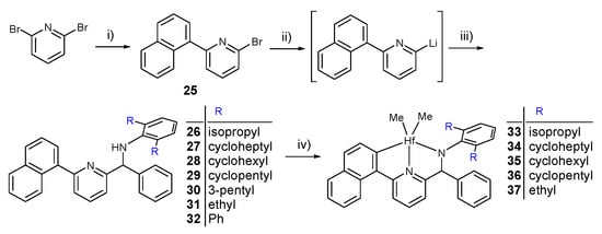 The synthesis of Hf complexes: (i) 2-naphthylboronic acid, (Ph3P)4Pd; (ii) t-BuLi (2 eq); (iii) 2,6-R2C6H3N=C(H)Ph; and (iv) HfMe4 for 33 and 35–37; n-BuLi, HfCl4, and MeMgBr (3.5 eq) for 34.