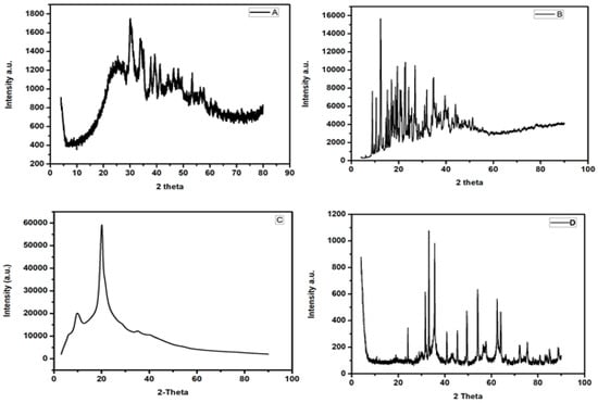 XRD of (A) mesoporous carbon, (B) beta-cyclodextrin, (C) chitosan and (D) MMPC/Cyc-Chit nanocomposite composite.