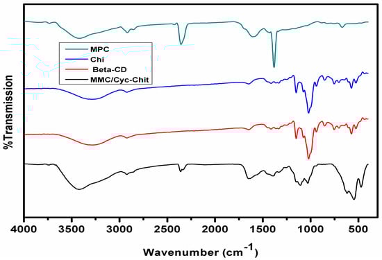 FT-IR spectra of MPC, Chi, beta-CD and MMPC/Cyc-Chit composite.