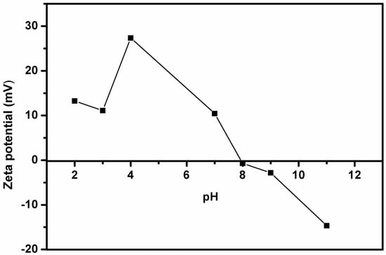 The pH of the FQs solution might have an effect on their adsorption on the surface of the MMPC/Cyc-Chit nanocomposite. Moreover, the pH of the sample solution was used to assess the distribution percentage of the investigated FQ species during their adsorption process. For example, subject to the pH of the sample solution, the surface of the nanocomposite could be protonated or deprotonated, thereby changing the surface charge of an adsorbent. Therefore, it is important to investigate the pH at which negative and positive charges are equal, also known as pH at point of zero charge (pHpzc). This point will as assist in the determination of the possible adsorption mechanism. Therefore, the influence of pH onto the zeta potential of MMPC/Cyc-Chit nanocomposite was evaluated and results are shown in Figure 3. The surface MMPC/Cyc-Chit nanocomposite was positively charged at pH values lower than 8 and the pHpzc value was estimated as 8.0. This implied that MMPC/Cyc-Chit nanocomposite has a negative charge above pH = 8.0.
