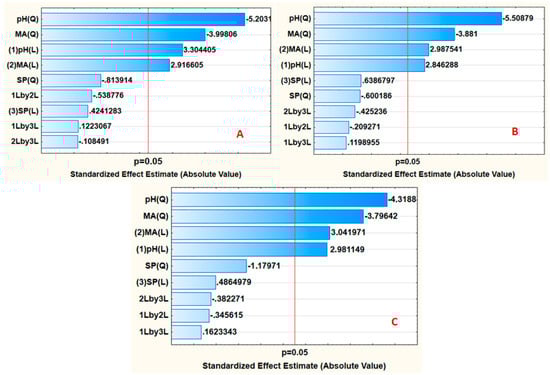 Pareto chart of standardized effects for adsorption of (A) DANO, (B) ENRO and (C) LEVO). MA = mass of adsorbent; SP = sonication power; 1Lby2L shows the interaction between pH and MA; 2Lby3L shows the interaction between MA and SP; 1Lby3L shows the interaction between pH and SP.