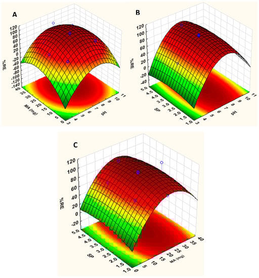 The 3D surface response plots describing the interactions of the parameters investigated. (A) interaction between sample pH and mass of adsorbent (MA); (B) interactions between sonication power (SP) and sample pH and (C) interactions between SP and MA.