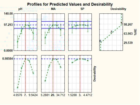 The desirability profile was used to estimate the optimum experimental conditions obtained using RSM optimization approach (Figure 6, Figure A3 and Figure A4). The optimal conditions for the removal of fluoroquinolones were sample pH: 7.0, mass of adsorbent: 36 mg and sonication power level 3. The sonication or contact time, initial concentration and sonication frequency were fixed at 30 min, 10 mg L−1 and 50 Hz. Under the abovementioned conditions, the predicted removal efficiencies of the model for the adsorption of DANO, ENRO and LEVO were 97.2%, 98.3 and 95.3%, respectively. To certify the acceptability of the RSM model and to confirm the agreement between the predicted and experimental removal efficiency, six replicates were carried out at the abovementioned conditions. The obtained experimental results showed removal efficiencies of 98.7 ± 1.3%, 99.1 ± 0.9% and 96.8 ± 1.2% for DANO, ENRO and LEVO, respectively. These results showed that the RSM model could be considered an accurate and valid procedure for the optimization of the adsorption process.