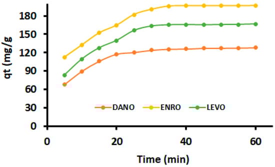 The adsorption kinetics data (Figure 7) were used to study the adsorption process of FQ antibiotics onto the surface of the nanocomposite. The data were analysed using three commonly used kinetic models; namely, pseudo-first-order, pseudo-second-order and intraparticle diffusion. The equations of these kinetic models are widely reported (See Table 1), and they were adapted from the literature [66,67,69].