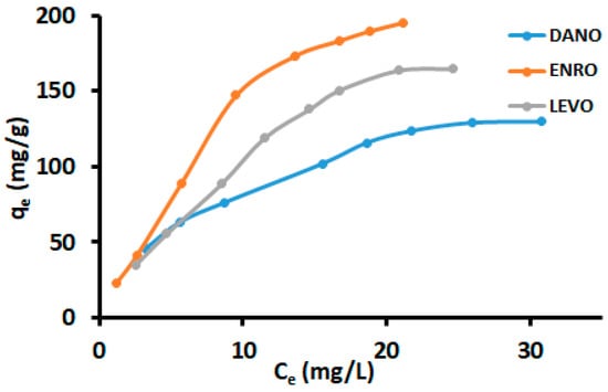 The estimated parameters are presented in Table 4. As it is indicated, the R2 values achieved for pseudo-second-order were constantly higher compared to those of pseudo-first-order. In addition, the adsorption capacities obtained using the pseudo-second-order kinetic model were in agreement with experimental values. These outcomes suggested that the rate-determining step might be dominated by chemical interactions of FQ antibiotics with the homogenous surface of the adsorbent. The chemisorption mechanism might be driven by electrostatic attraction between the adsorbent and FQs. The dissociated forms FQ antibiotics have carboxylate and nitrogen functional groups that can bind on the positive or negative adsorbent surface.