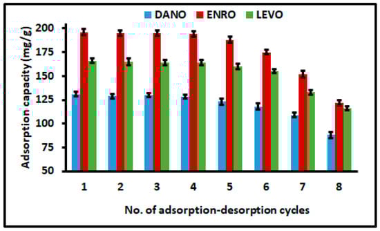Regeneration and reusability for spent adsorbent are two of most crucial factors from the cost-effective point of view. This study investigated the possibility of regenerating and reusing the spent nanocomposites-loaded with FQ antibiotics. The regeneration and reusability process was performed according to the procedure described in Section 2.5. As seen in Figure 9, the regenerated nanocomposite retained 90–100% of its adsorption capacity toward the removal of DANO, ENRO and LEVO, after five cycles of the desorption–adsorption. Furthermore, the adsorption capacities of the spent adsorbent for removal of DANO, ENRO and LEVO remained at 88, 122 and 116 mg g−1, respectively, after the eighth cycle. Furthermore, the spent adsorbent after the eighth cycle was used for the removal of FQ antibiotics. It was observed that even though the adsorption capacities decreased, the removal efficiency remained above 95%. These results demonstrated that the nanocomposite can be reused several times without affecting its removal efficiency. Additionally, it was then concluded that the prepared nanocomposite had relatively high chemical and thermal stability.