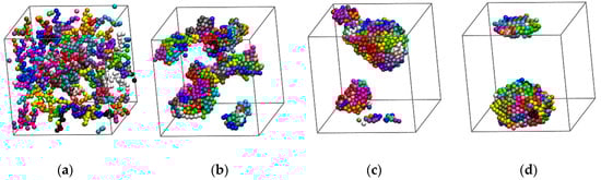 (a) Snapshot of the athermal polymer system (100-chain N = 12, ϕ = 0.05) serving as the initial configuration for all successive Monte Carlo simulations on chains interacting with the square-well (SW) potential. (b–d) System configurations for the SW chain system (ε = 1.0 and σ2 = 1.2) after 106, 2 × 108 and 1.2 × 1012 Monte Carlo moves, respectively. The number of clusters is (a): 73, (b): 8, (c): 3 and (d): 1. The formation of a stable single cluster occurs at approximately 5 × 109 steps. Monomers are color-coded according to their parent chain. Coordinates of sphere centers are subjected to periodic boundary conditions in all dimensions. Image created with the VMD software (version 1.9.3, Theoretical and Computational Biophysics Group, University of Illinois, Urbana, IL, USA) [72]. 3-D, interactive versions of the figure panels exist in supplement material (as well as a 3-D, interactive version of the present manuscript).