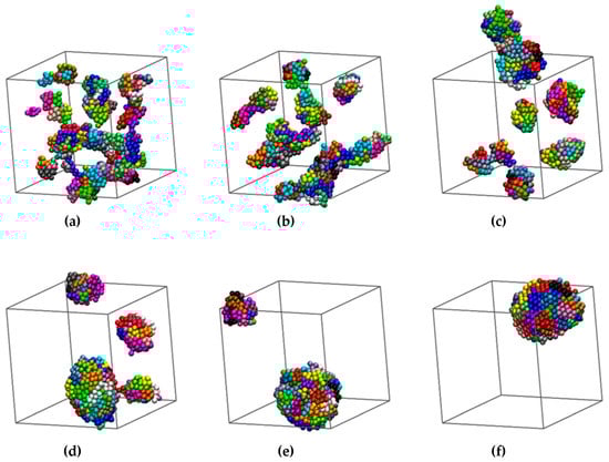 For weak attraction and/or short-range of interactions, individual clusters are small and may lie far from each other. In addition, when they meet their connection points (bridges), usually in the form of a single monomer, they can be easily deleted in successive steps due to the reversibility of the MC scheme. Clusters of initial random shape and size grow either by appending individual chains or through merging with other clusters. Again, depending strongly on the applied interaction parameters, the final single cluster may become more spherical and more symmetric compared to clusters at intermediate stages. Visual inspection of the final single cluster, as seen wrapped in panel (d) of Figure 1 or unwrapped in panel (f) of Figure 2, reveals further the formation of well-ordered patterns. Such ordering is, in general, absent in clusters of small size.