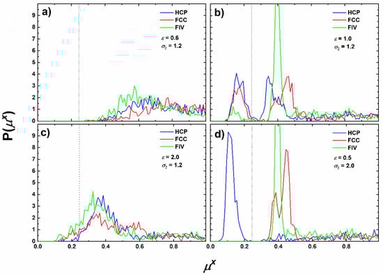 Probability distribution of the HCP- (blue), FCC- (red) and FIV- (green) CCE norm as obtained from structural analysis on the final system configuration for the SW chain systems: (a) ε = 0.6 and σ2 = 1.2; (b) ε = 1.0 and σ2 = 1.2; (c) ε = 2.0 and σ2 = 1.2; (d) ε = 0.5 and σ2 = 2.0. The vertical dotted line denotes the threshold value (μc = 0.245) for the identification of HCP, FCC or FIV local environments of non-overlapping spheres.