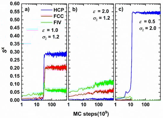 The evolution of the CCE order parameters, SX, (X being HCP, FCC or FIV) as a function of MC steps can be seen in Figure 4 for the same representative systems as in Figure 3 except for (ε = 0.6 and σ2 = 1.2). The latter is not shown because the corresponding order parameters do not vary with simulation time, as the system remains amorphous with no traces of crystalline or fivefold domains; thus, the Sx-versus-MC steps curves practically coincide with the x-axis.