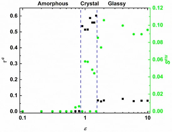 (Left y-axis) Degree of crystallinity, τc, (= SHCP + SFCC) and (right y-axis) fivefold order parameter, SFIV, as a function of the interaction intensity, ε, of the square well potential for a fixed range (σ2 = 1.2) in log-linear scale. Vertical dashed, blue lines indicate the transition from amorphous to crystal and from crystal to fivefold-rich glassy regimes as dictated by the population of closed packed and fivefold sites and the corresponding established morphologies.