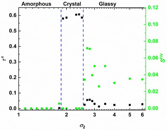 (Left y-axis) Degree of crystallinity, τc, (= SHCP + SFCC) and (right y-axis) fivefold order parameter, SFIV, as a function of the interaction range, σ2, of the square well potential for a fixed intensity (ε = 0.5) in log-linear scale. Vertical dashed, blue lines indicate the transition from amorphous to crystal and from crystal to fivefold-rich glassy regimes as dictated by the population of closed packed and fivefold sites and the corresponding established morphologies.