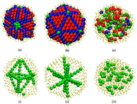 Figure 8 presents in more detail selected chain morphologies containing fivefold symmetry. In the upper panels the whole system is visualized including close packed nuclei or crystals, while in the lower panels only fivefold and amorphous sites are shown. Isolating the fivefold structures allows us to understand their possible self-assembly and organization especially when co-existing with crystals. In parallel, beyond visual inspection the complete information of sphere coordinates, considering periodic boundary conditions, allows us to perform a twin element analysis based on Koch’s standard International Union of Crystallography calculation [73], following the steps of Ref. [29]. Linear arrangements of fivefolds have a structure of multiple, cyclic twin. For the cyclic twin morphologies, we can observe that numerous twin sectors have been fully assembled in spite of the finite size of the encasing cluster. When twin boundaries meet, the corresponding boundaries consist of fivefold sites as imposed by the twin composition law. According to panel (ii) the axis consists of spheres which show pseudo fivefold symmetry. The structure can be viewed effectively as a linear array of parallel stacked pentagons or a pile of pentagonal bipyramids [3,74] reminiscent of concentric pentagons of the Bagley packing sequence [75].