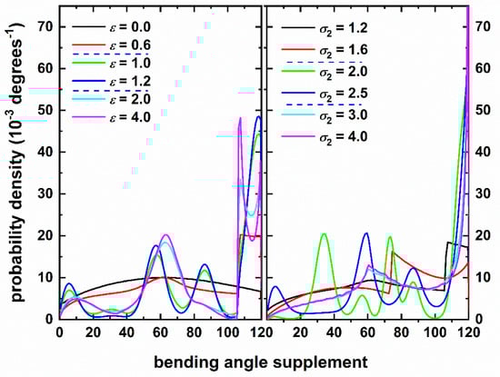 Distribution of bending angle supplement as a function of (left panel): attraction intensity for fixed range (σ2 = 1.2) and (right panel): attraction range for fixed intensity (ε = 0.5). Dashed horizontal blue lines in legend identify transitions to different phase regimes: amorphous crystalline glassy.