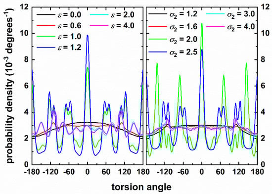 Torsion angle distribution as a function of (left panel) attraction intensity for fixed range (σ2 = 1.2) and (right panel): attraction range for fixed intensity (ε = 0.5). Zero degrees correspond to trans conformation.