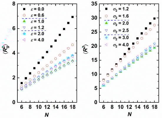 Long-range chain structure is quantified here by the mean square radius of gyration, , and the mean square end-to-end distance, . For the freely jointed model in the limit of infinitely long chains () it stands: . Given that in the present work we model polydisperse chain systems () within a single simulation we can extract the dependence on chain length. Accordingly, in the continuation angle brackets < > correspond to averaging over all chains of specific length N and over all recorded frames. The -vs.-N and -vs.-N curves are presented in the left (varied ε and fixed σ2) and right (varied σ2 and fixed ε) panels, respectively, of Figure 11. The first conclusion is that for all system studied or scale linearly with the number of monomers, independently of interaction type. The athermal system exhibits the largest size followed by those of weak interactions or short attraction range. The chain crystals are the ones that systematically show the shortest size especially when compared to the reference hard-sphere chain. This can be understood as monomers inside the compact cluster and/or crystal adopt configurations that minimize the local free volume, as indicated for example by the global maximum of 120° in the bending angle distribution.