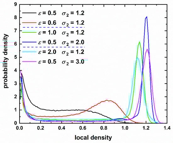 Distribution of local density for various pairs of intensity, ε, and range, σ, of the square well potential. Local density is calculated as the inverse of the volume of the Voronoi cell around each monomer. The corresponding final morphologies can be seen in Figure 7. Dashed horizontal blue lines in legend identify transitions to different phase regimes: amorphous crystalline glassy.