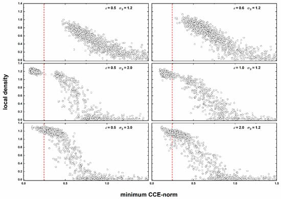 For the crystal clusters there is a clear tendency for the ordered sites to be concentrated in the range of very high density values. A gap can be observed in the continuity near the threshold transition (μc = 0.245), as indicated by the dashed vertical line in the panels of Figure 14. Glassy systems do not show this discontinuity and the transition before and after the crystal onset is quite smooth. Only the glass cluster corresponding to (ε = 2.0, σ2 = 1.2) shows dispersion of density values as a function of the CCE-based structural similarity in the low-CCE regime of μc < 0.245.