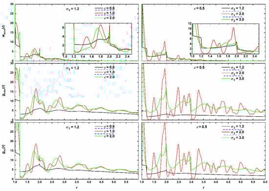 (Top panels) Intramolecular density function, wintra(r); (middle panels) intermolecular pair distribution function, ginter(r) and (bottom panels) total pair radial distribution function, gtot(r) as functions of radial distance, r, for (left column) various attraction intensities, ε, for fixed range (σ2 = 1.2) and (right column) various attraction ranges, σ2, for fixed intensity (ε = 0.5). Black, red and green correspond to SW chain clusters being amorphous, crystalline and glassy, respectively. Insets in the wintra panels correspond to zoom into short radial distances and the analogous peaks. Dashed horizontal blue lines in legend identify transitions to different phase regimes: amorphous crystalline glassy.