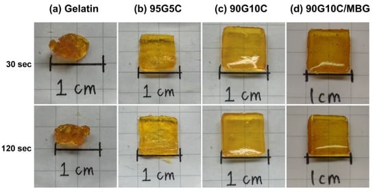 Figure 9 demonstrates the synergistic effect of collagen and MBG on the mechanical properties of the composite gel. The image was taken when the gel sample was fully compressed, followed by release of the force. As shown in Figure 9b, the gel shape became irregular even for gels containing MBG particles with 120 s of exposure. However, the compression force did not cause significant cracks in the sample containing collagen and MBG. These tensile and compression tests indicated that collagen and MBG enhanced the composite gel stiffness and elasticity.