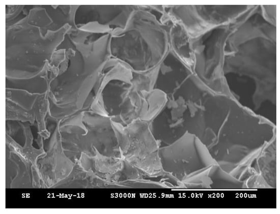 The degree of photocrosslinking is known to depend on the irradiation time and the concentration of photosensitive molecules. Therefore, a shortened irradiation time will decrease the degree of photocrosslinking and may result in an incomplete sol-gel transformation. As shown in Figure 2, regardless of the irradiation time, the phase transformation from solution to gel was not complete for samples crosslinked by dityrosine formation representing gelatin only. However, the gel shape was observed to keep its integrity with increasing collagen content at the same exposure time, even for only a short (30 s) exposure time. The images indicate that, compared with gelatin alone, the additional collagen fibrils improved the geometric stability of the gel. However, the shapes of the gels with and without MBG were not significantly different (Figure 2c,d). In general, materials with higher crystallinity have higher structural stability and mechanical strength. Gelatin is denatured collagen without the typical helical structure of the protein and an amorphous structure. In contrast, collagen is a major structural protein in mammalian animals and consists of long fibrils with a semicrystalline structure []. Moreover, MBG is harder and tougher than gelatin and collagen. Based on these physical and structural characteristics, collagen fibrils and MBG reinforced the integrity of the gelatin matrix even after a short exposure time. The surface morphology of 90G10C containing 20% MBG hydrogel was examined via scanning electron microscope (SEM, HITACHI, S-3000N, Tokyo, Japan) at 15 kV. The image (Figure 3) indicated that MBG did not alter the formation of a high-porosity matrix.